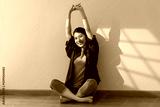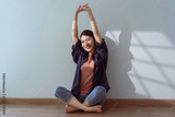 Young woman stretches elegantly in a serene indoor space filled with natural light