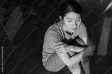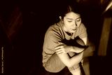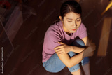 Young Asian woman sitting in a cozy interior space with warm sunlight illuminating her thoughtful expression
