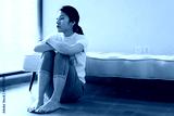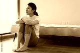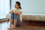 Woman sitting on the floor in a minimalist room with natural light, contemplating her thoughts in a serene environment
