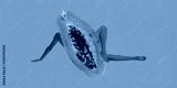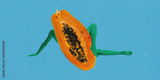 Poster. Contemporary art collage. Green human limbs extending from juicy papaya center. Concept of vitamins, tropical food, surreal body, energy, harvest, health, creativity, summer.