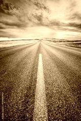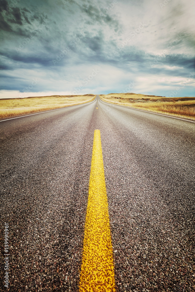 Highway lane close up retro toned picture, focus on foreground, travel concept, USA.