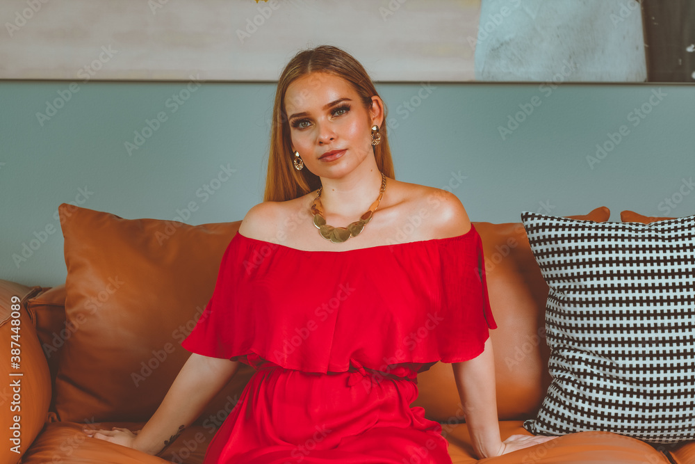 Summer sand beach with tropical sea, palm leaves and sunlight in the background