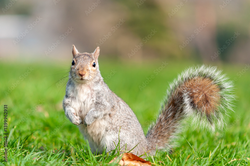 Gray squirrel standing upright on green lawn with tail curled and looking directly at camera in natural light for animal photography