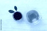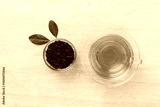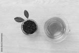 Cup of tea with dry and fresh leaves on wooden background, top view