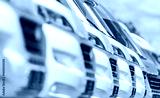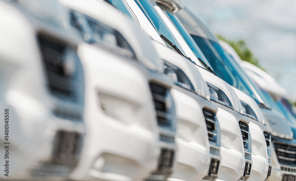 Many White Motorhome Camper Van Vehicles Lined up in a Dealer Lot Under a Clear Sky