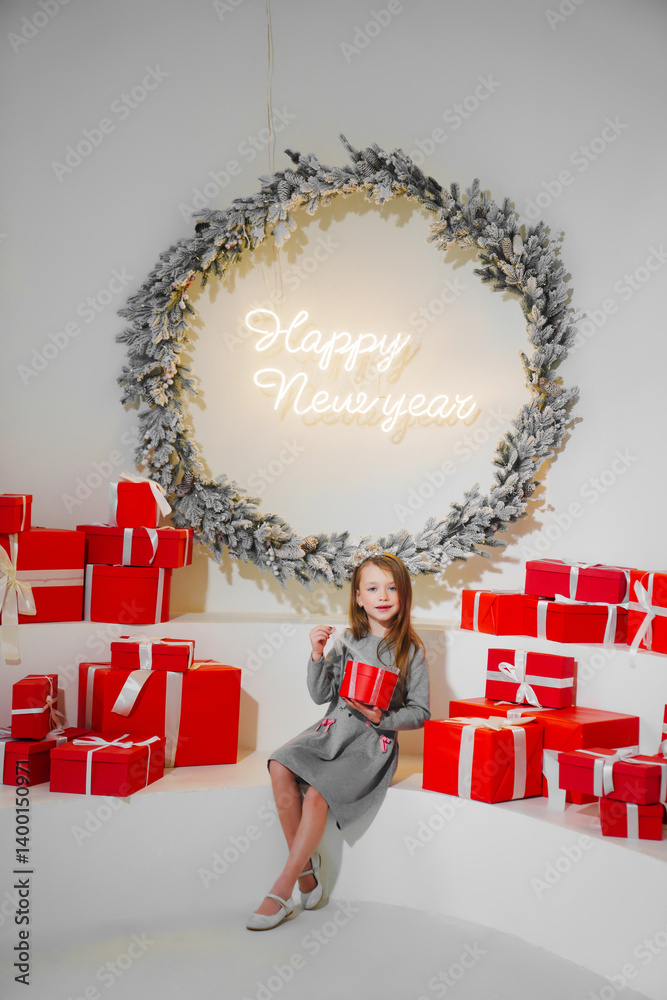Cute little girl with red gift box in christmas decor.