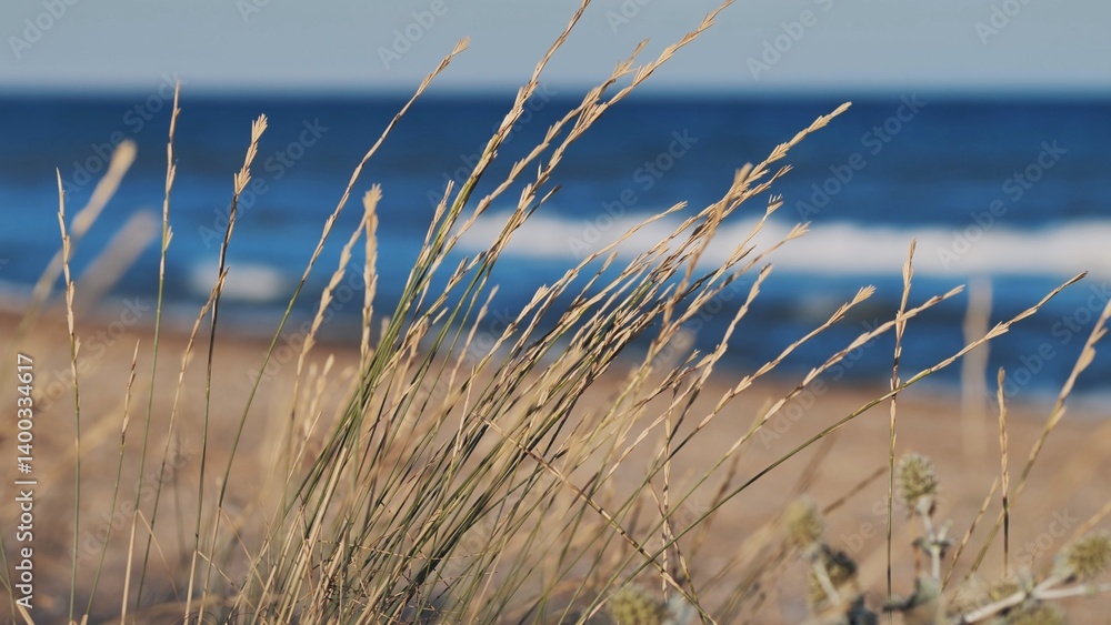 Beach grass swaying in the Crimean peninsula breeze with blue sea in background