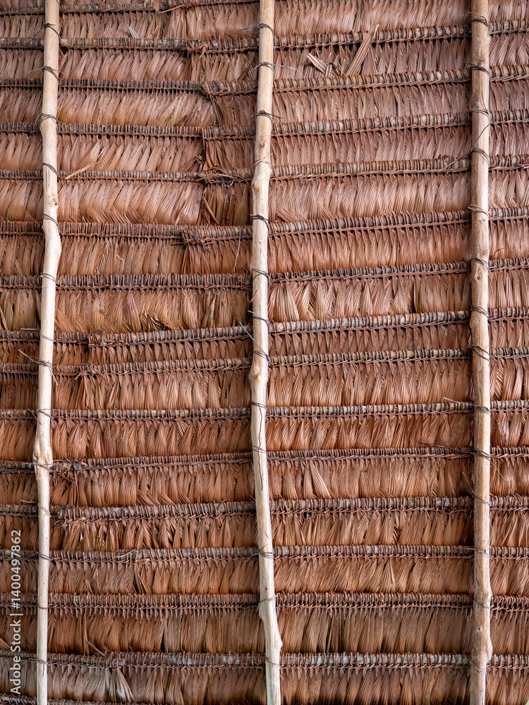 The thatched roof construction of a Maloca from the inside at an indigenous Ticuna tribe.