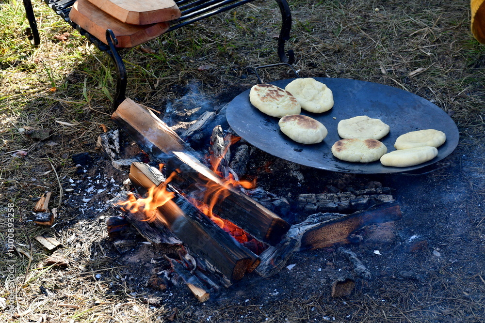 A close up on dumplings or shortbread cookies baked by using an iron pan laying in the firewood composed of logs, planks, and boards, seen next to an iron grate and a lush lawn in Poland