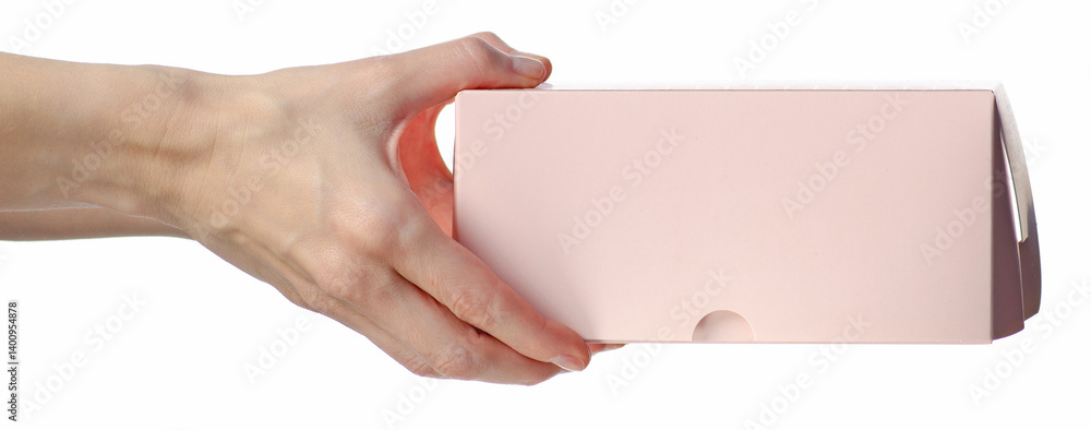 Pink bakery box for cakes or cookies in hand on white background isolation