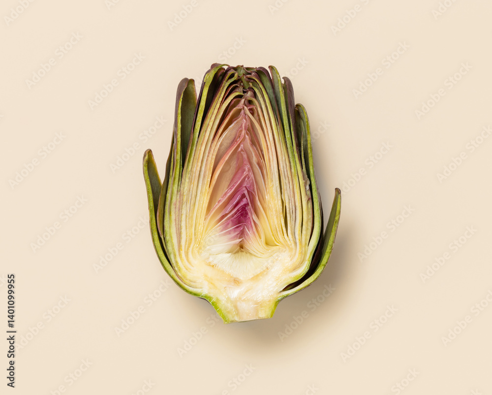 Cut raw purple artichoke on light yellow background top view. Fresh vegetables for vegetarian diet