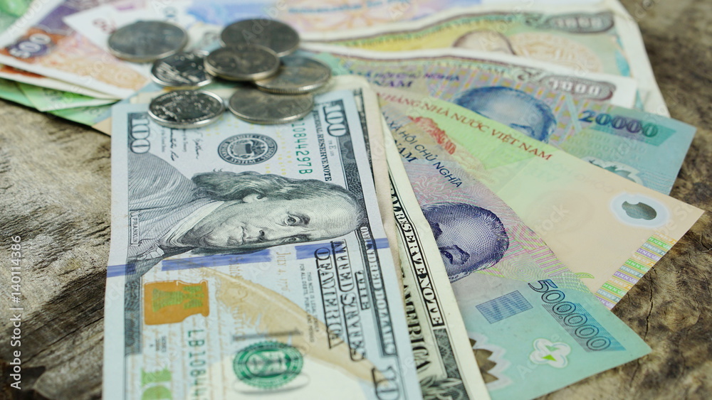US dollars, Korean Won, Euro bills and some money bills and banknotes. Currency foreign exchange. Business and Financial or money management for investments.
