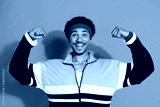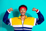 Energetic young man in retro sportswear showcasing vibrant confidence on a turquoise background, embodying a sporty and joyful lifestyle