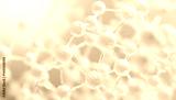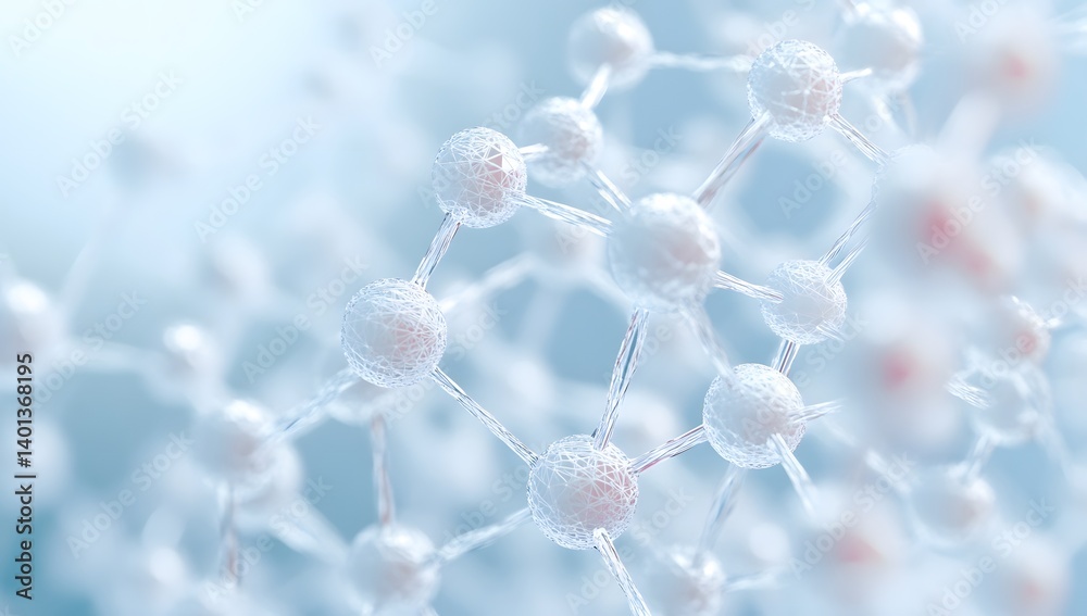 Abstract molecular structure illustration with interconnected spheres on a light blue background.