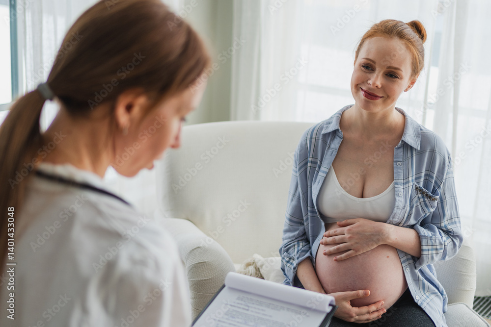 Female doctor examining pregnant woman in doctor office. Pregnant girl patient have consultation in hospital. Gynecologist doctor consulting patient about pregnancy. Visit to doctor medical checkup