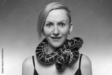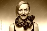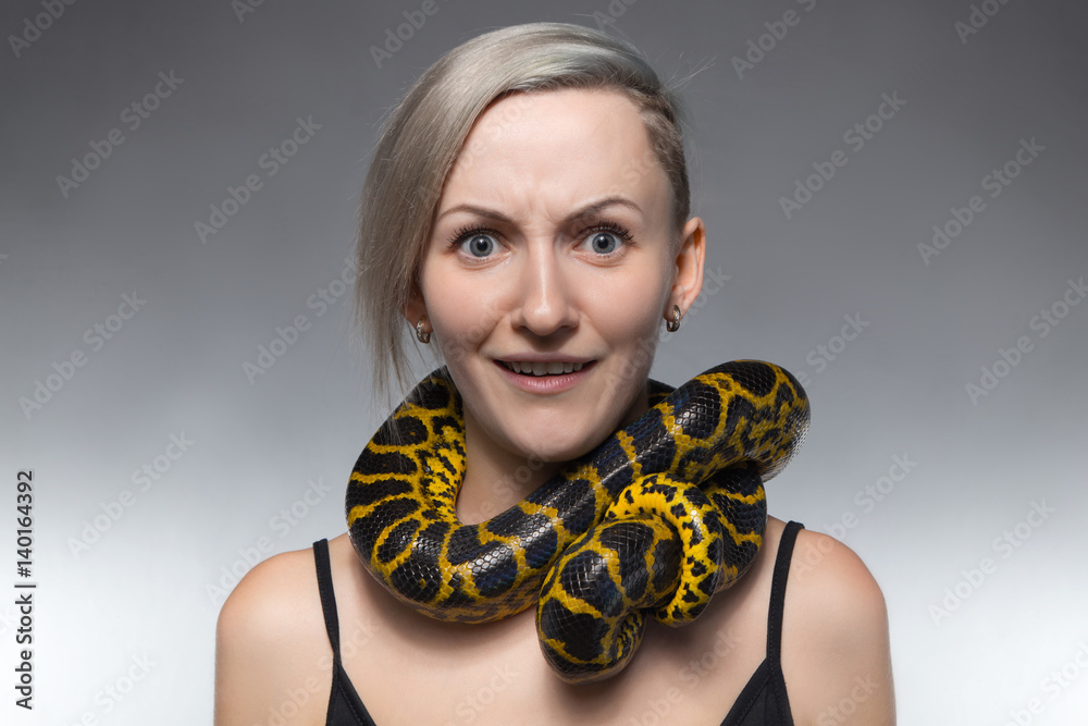 Scared woman with anaconda on her neck