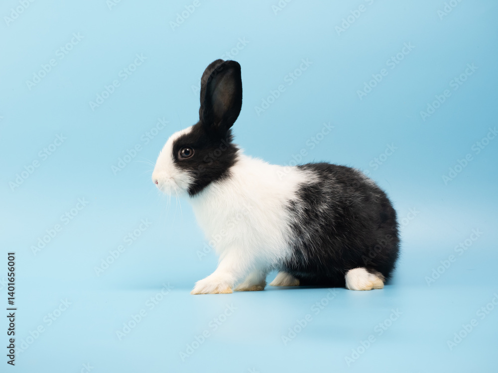 Front view of cute baby rabbit sitting on blue background. Lovely action of young rabbit.