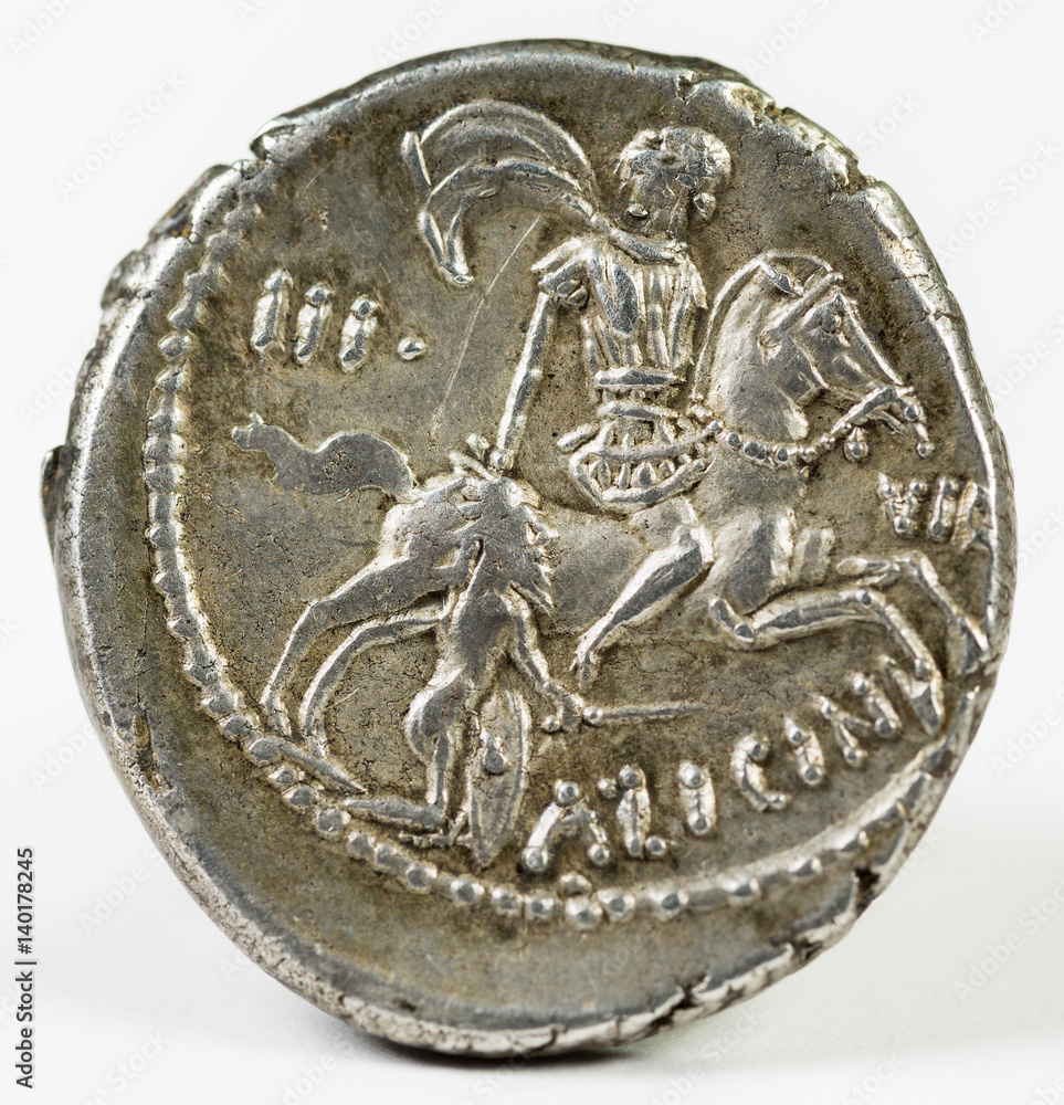Ancient Roman silver denarius coin of A. Licinius Nerva. Reverse.