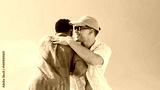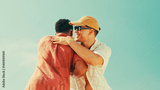 Smile, men and friends for hug outdoor for greeting, meeting and success of getaway vacation. Below, people and blue sky with embrace of reunion agreement, introductions and thank you of holiday trip