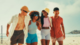 Happy, laugh and friends hug on beach for summer vacation, holiday and adventure together. Nature, travel and men and women by ocean or sea for bonding, relaxing and laughing on weekend outdoors