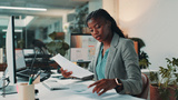 Black woman, documents and reading by computer in office for project, admin and review for proposal. Person, paperwork and pc for research, planning and feedback for perspective at creative agency