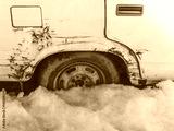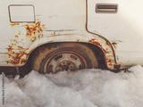 Old white rusty car. Wheel