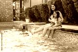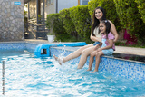 Young indian mother and little child daughter enjoy splashing water at swimming pool in summer holiday, India Family having fun relaxing together at hotel resort vacation. Bonding and togetherness