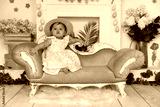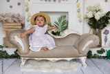 Adorable baby girl in a lavender dress and straw hat sitting on a vintage beige couch in a floral Easter-themed setting
