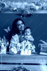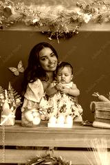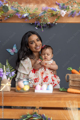 Easter-themed wooden stand decorated with carrots. baby is holding a carrot and wearing a floral dress, while the mother smiles beside her, surrounded by colorful butterflies and festive decorations
