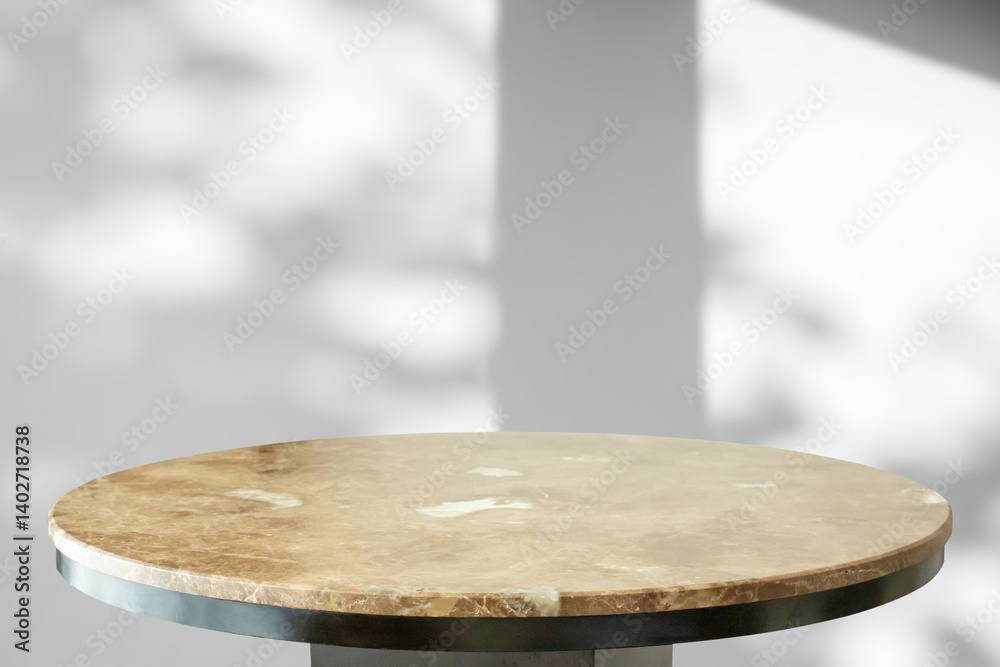 Round marble table top with tree leaves shadow drop on white wall background for mockup product display
