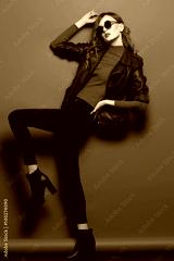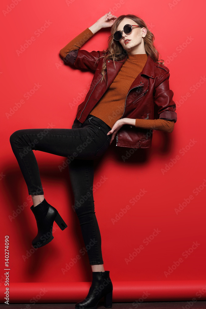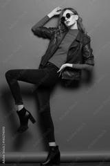 fashion model in sunglasses, beautiful young woman. leather jacket, studio shot