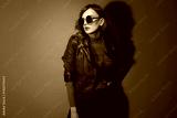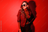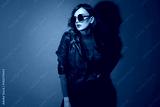 fashion model in sunglasses, beautiful young woman. leather jacket, studio shot