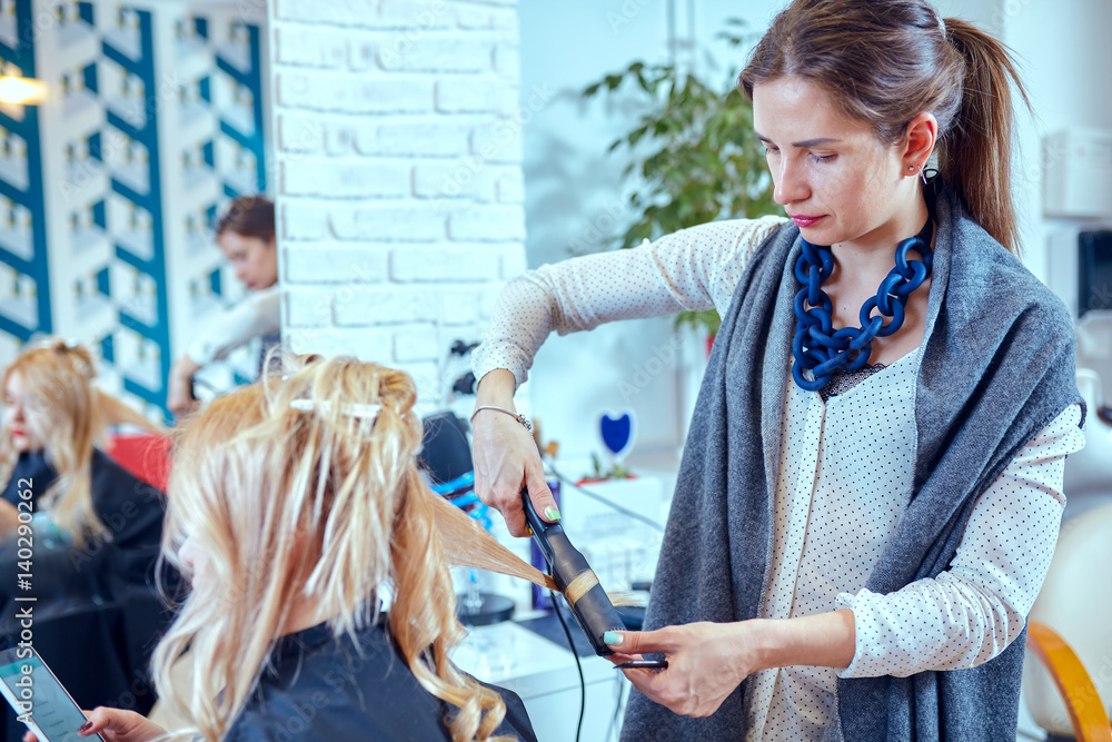 Hair styling in a beauty salon .