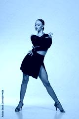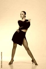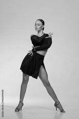 Graceful Latin dancer in stylish black costume posing on colorful pink-lit studio backdrop.