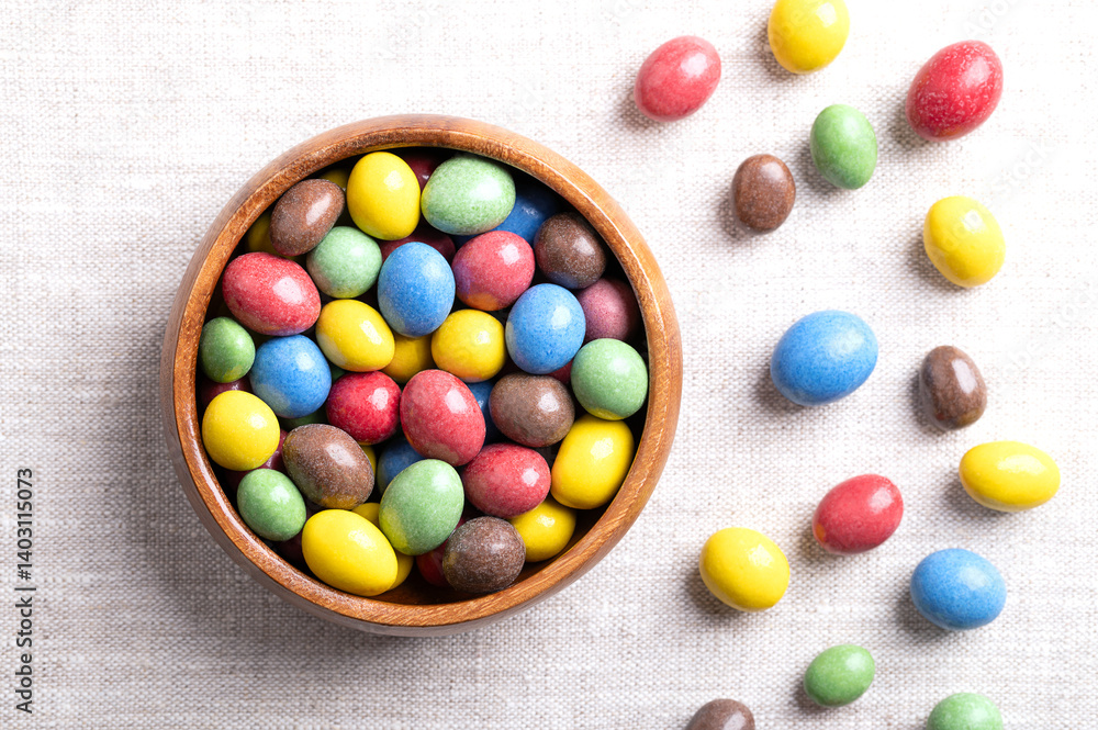Candy coated milk chocolate peanuts in a wooden bowl on linen fabric. Roasted peanuts, coated with milk chocolate, with multi-colored sugar coating. Colorful sweet and treat. Close-up from above.