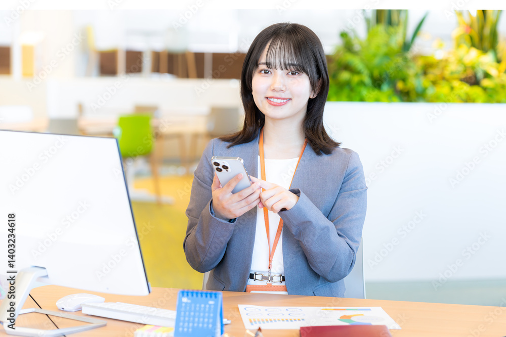 オフィスでスマホを持つビジネスウーマン【撮影協力:学校法人電波学園 東京電子専門学校】