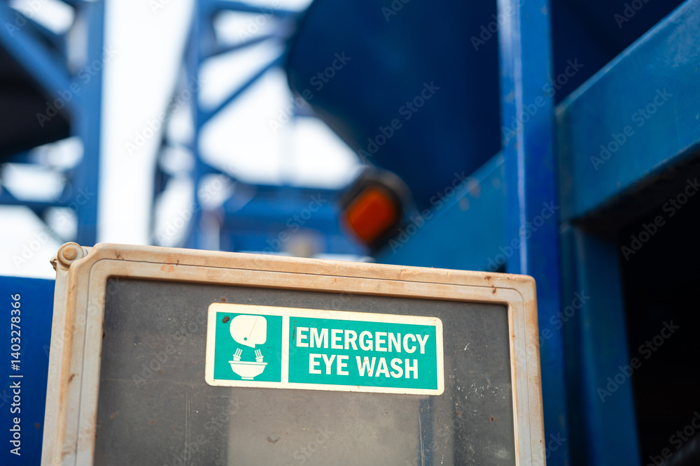 Emergency eye-wash station at the drilling rig operation site, using for chemical splashing or spilling into eye or face. Safety equipment object for the industrial.