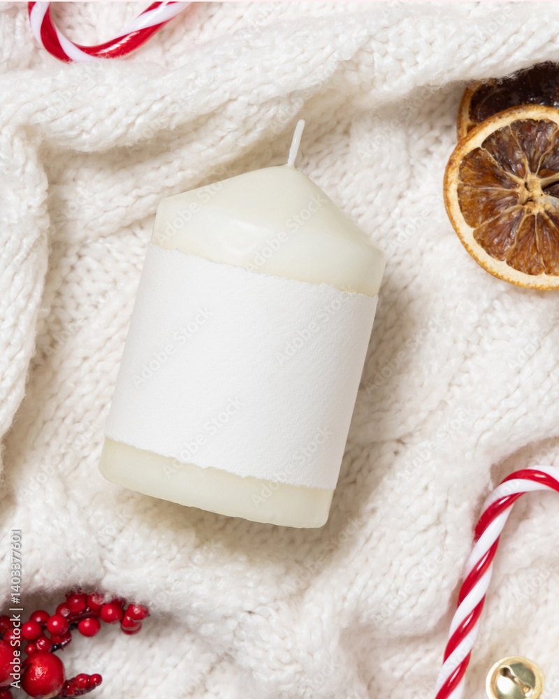 White pillar candle with blank label on white knitted sweater near Christmas decor, winter mockup