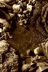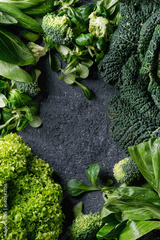 Variety of raw green vegetables salads, lettuce, bok choy, corn, broccoli, savoy cabbage as frame over black stone texture background. Top view, space for text