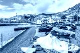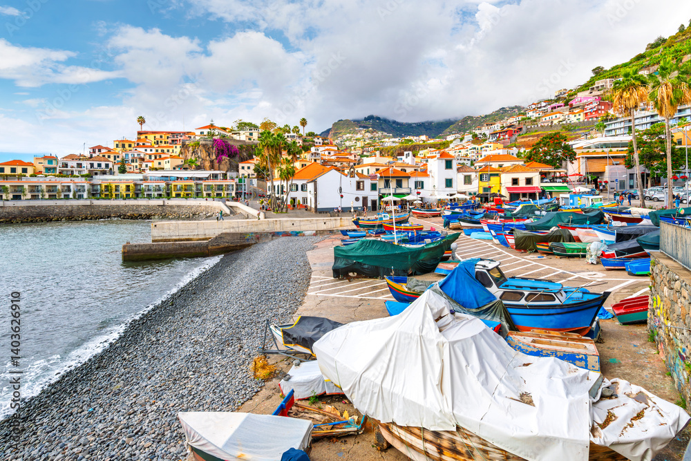 View from the pebble beach and marina of the colorful seaside village of Camara de Lobos, Portugal, on the Atlantic island of Madeira.