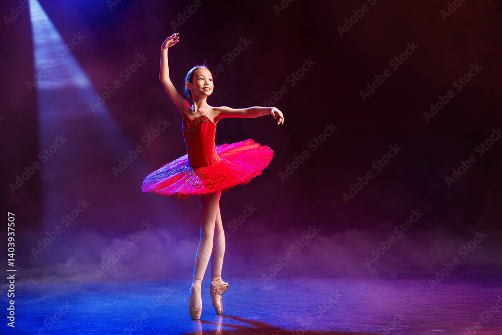 Little Ballerina gracefully dances in pointe shoes on stage in bright red tutu against dramatic spotlight background