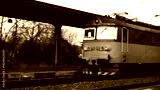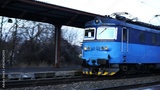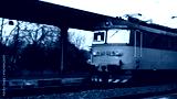 Blue electric locomotive passing through a rural train station with blurred motion, highlighting modern railway transportation and speed.