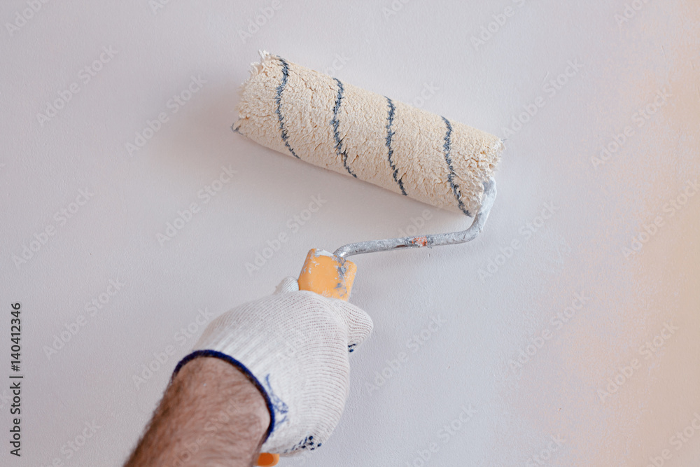 Close up view of man's hand wearing gloves holding paint roller, wall painting on a white background