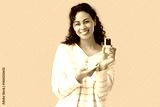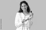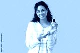 African-American woman with pulse oximeter on beige background