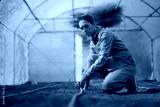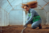 Greenhouse Worker Arranges Irrigation Hoses. Person responsible for the correct irrigation of their own crops