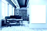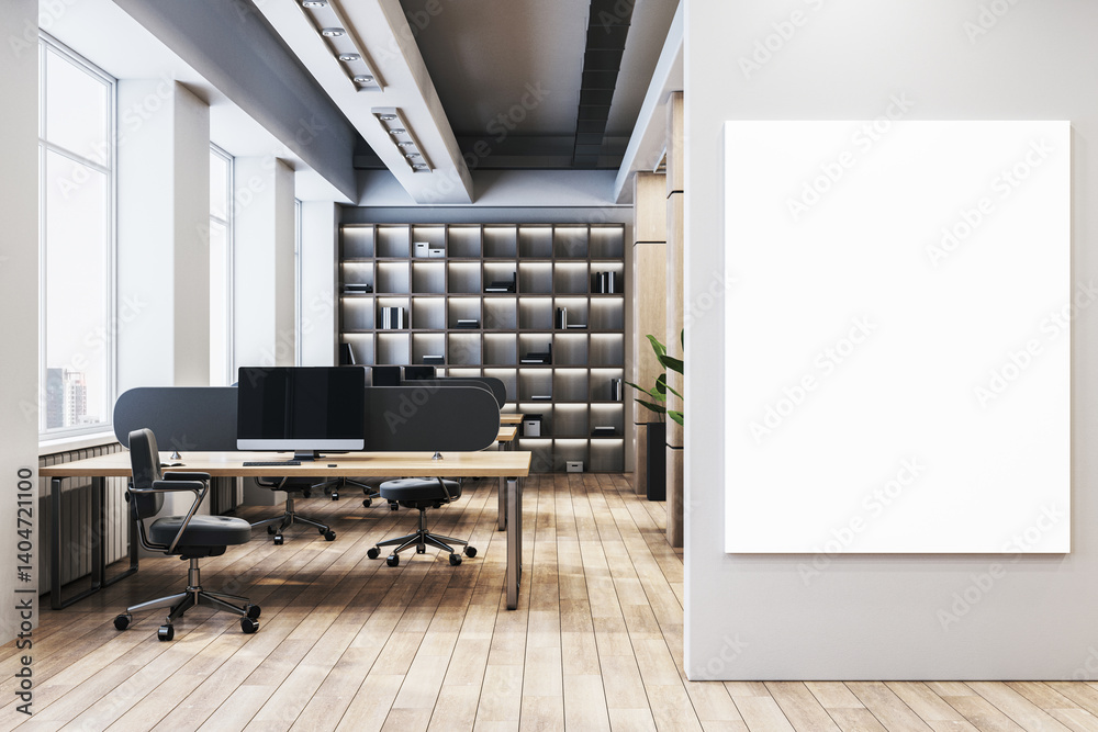 Modern spacious office interior with desks, computers, shelves, and a vertical blank poster frame on the wall by the entrance area. 3D Rendering