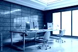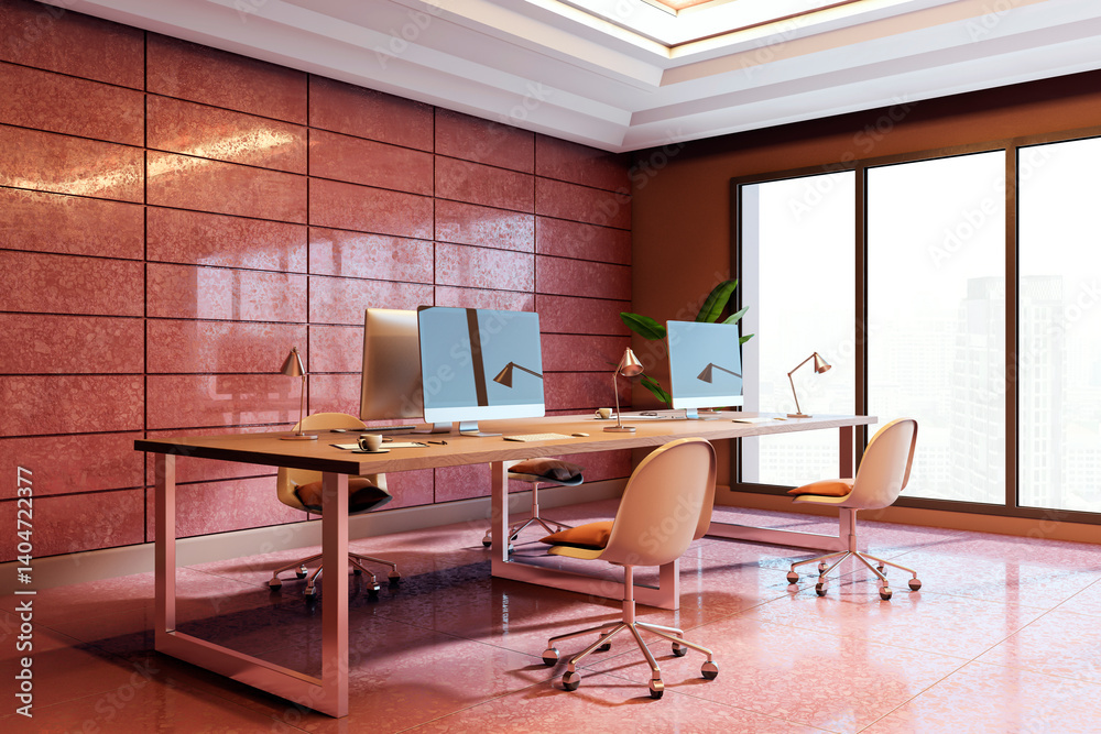 Modern office interior with pink tiled walls, large windows, and minimalist furniture setup in a clean and contemporary business building space. 3D Rendering
