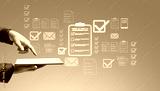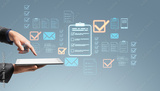 Businessperson using digital tablet with floating icons for checklist, messages, and data management on light blue background conceptually visualized.