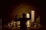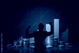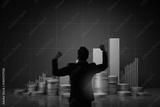 Businessman celebrating financial growth with stacked coins and bar chart on dark blue background, symbolizing success and capital rise in business.