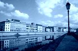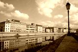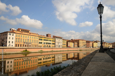 Historical buildings stretched alongside river Arno in the historical center of the italian city Pisa.